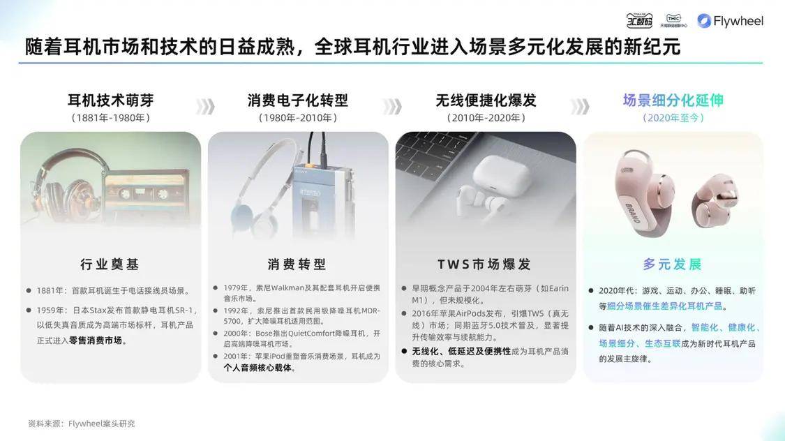 纵观全球耳机行业百年发展,其演进脉络清晰可见:从技术萌芽期的专业工具,逐步转型为大众消费电子品类,并在近十年迎来无线化爆发与场景化延伸。