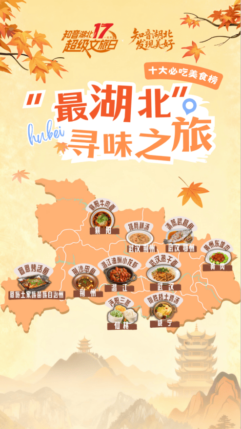 11月超级文旅日以美食为主题,经过网友踊跃推荐、热情点赞与专业评审,“最湖北”寻味之旅十大必吃美食榜正式揭晓,排骨藕汤、热干面、清蒸武昌鱼、黄州东坡肉、沔阳三蒸、襄阳牛肉面、贺胜桥土鸡汤、荆沙甲鱼、潜江油焖小龙虾、宣恩烤活鱼十道具有地方特色的美食入选榜单,成为这个秋冬最具吸引力的文旅名片。