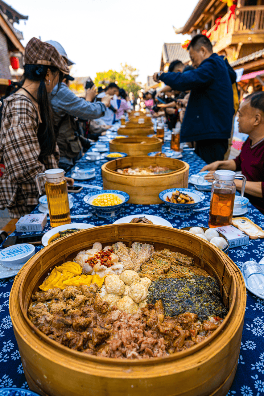 采风团先后走进梦里水乡、沔阳小镇,泛舟水上森林,观看水上婚礼,欣赏大雁伴飞、飞车绝技。为了提升活动效果,一场大型行进式融媒体直播在沔阳小镇同步开启,吸引来自全网560万人次线上观看。近百名游客朋友与采风团共进长桌宴,“开笼咯……”仙桃市沔阳三蒸美食协会荣誉会长李和鸣领衔开笼仪式,一道道沔阳三蒸,17项非遗美食轮番亮相,现场游客朋友纷纷拍照打卡,连连点赞。