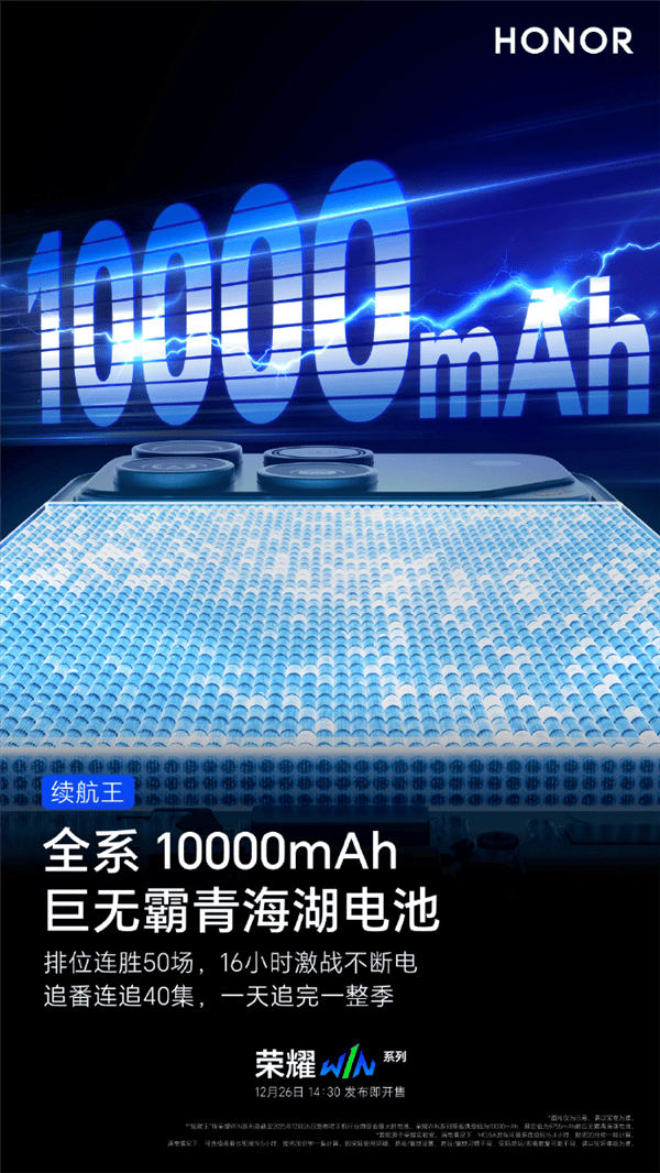 如果说散热保障了性能的持续释放,那么超长续航就是让电竞体验“不中断”的关键兜底。荣耀WIN系列全系搭载10000mAh巨无霸青海湖电池,从根本上解决了这一痛点;同时配备100W有线W有线反充,其中荣耀WIN还额外支持80W无线快充,构建起“长效续航+快速回血”的全方位保障体系,“续航王”称号实至名归。