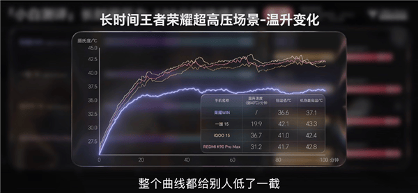 小白测评在高压游戏场景中实测发现,荣耀WIN不仅机身温度最低,并且温升曲线没有恒温值的,也就是说这些测试模型还远没有达到散热风扇的上限,称得上“战未来”了。