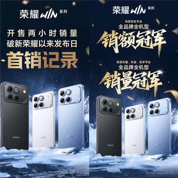“超神性能双旗舰”荣耀WIN与荣耀WIN RT的登场,不仅以3999元起、2599元起的定价打破旗舰电竞手机的价格壁垒,更在开售两小时内突破新荣耀以来发布日的首销纪录。26号开售当天,荣耀WIN系列斩获京东全品牌全机型销额冠军,以及天猫、抖音、快手平台全品牌全机型销量冠军!
