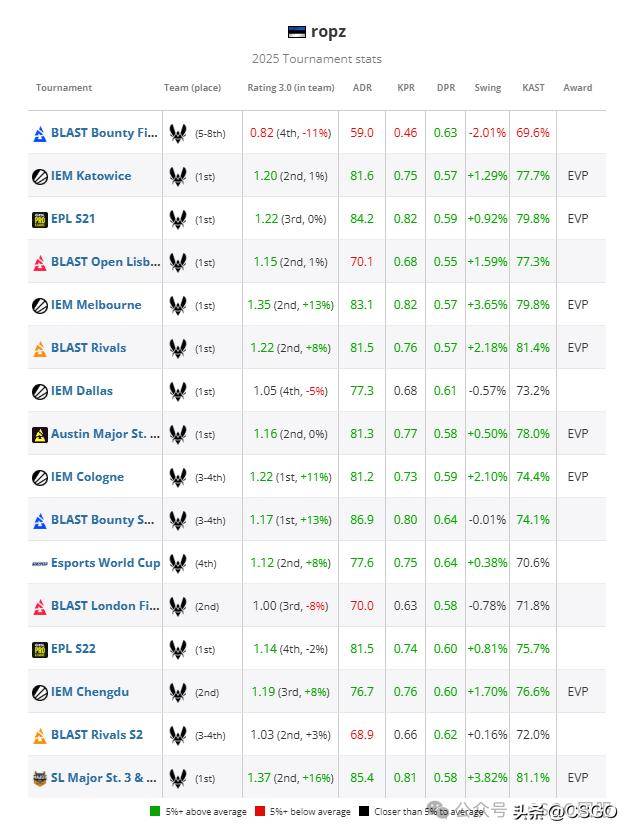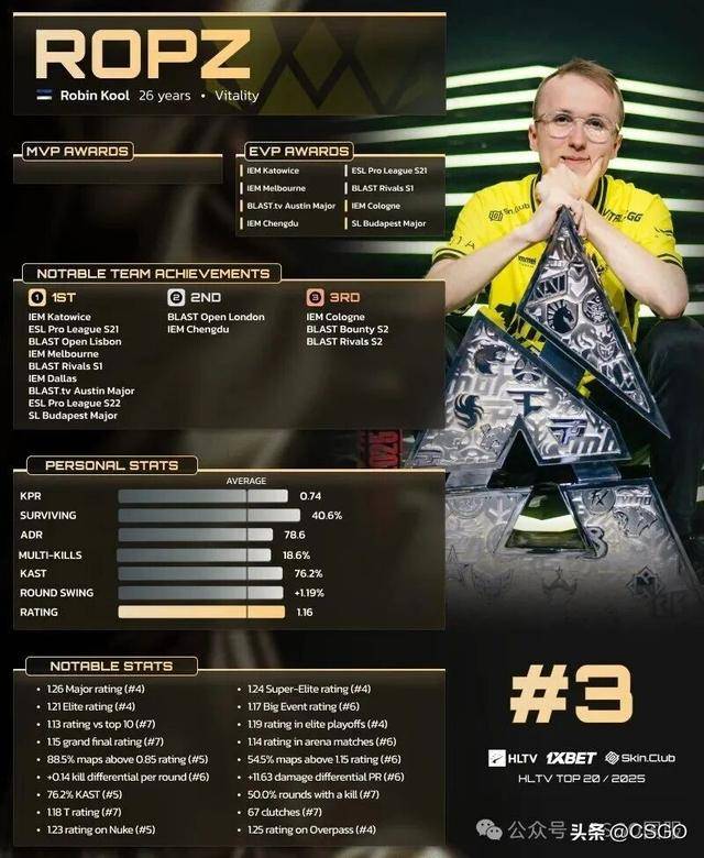 在争夺TOP3的战斗中,ropz凭借大量淘汰赛数据(场馆平均rating 1.14,排名第六;精英赛事平均rating 1.19,排名第四)的出色表现力压sh1ro,凭借四个超级精英赛事EVP超过m0NESY最终位列TOP 3。