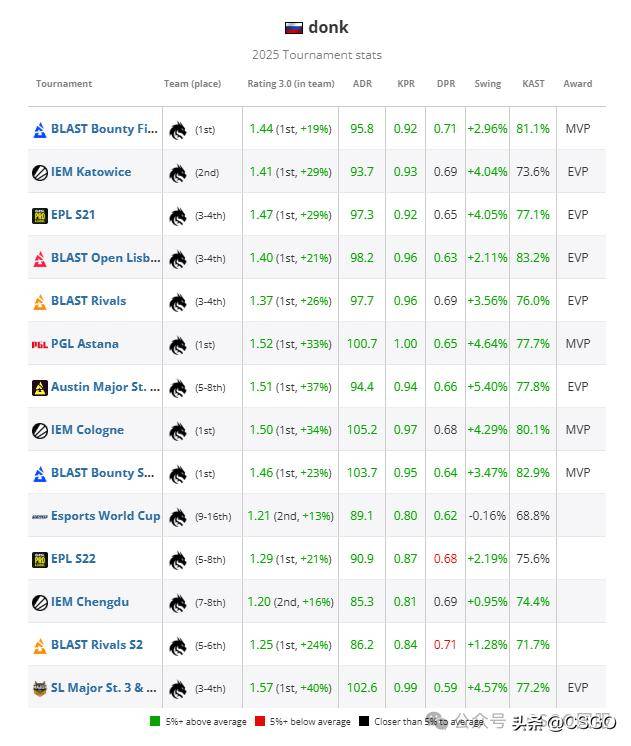 这位俄罗斯天才的年度数据堪称离谱,以至于要列举他没有排在第一的数据项反而会更容易一些——不过即便如此,结论依旧是令人震撼的:在所有赛事级别(Major、超级精英赛事、精英赛事、大型赛事以及全年整体)中,donk的Rating均高居榜首。在面对所有强度层级的对手(TOP5、TOP10、TOP20、TOP30、TOP50)时同样如此;无论是在小组赛、淘汰赛、场馆,还是精英级淘汰赛阶段,donk也始终保持着第一的位置。