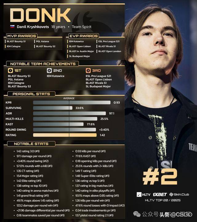 在2025年里,donk凭借着几乎无人能及的基础数据表现,稳稳锁定了TOP20榜单第二的位置。他在全年15次参赛计斩获11项个人荣誉,另有3次与奖项失之交臂,其中包括Spirit在BLAST赏金赛S1、PGL阿斯塔纳、IEM科隆以及BLAST赏金赛S2这四项夺冠赛事中的全部MVP。