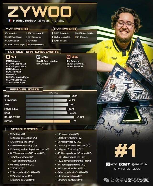 随着ZywOo在2025年斩获了八枚MVP奖章(包括两次Major冠军MVP),他创纪录地成为了四度荣膺TOP1的选手,同时成为了历史上唯二在一年内赢得如此多MVP的选手,追平了s1mple在2021年创下的纪录。不过,s1mple的八个MVP中仅有四个来自大型赛事,而ZywOo的八个全部来自大型赛事。