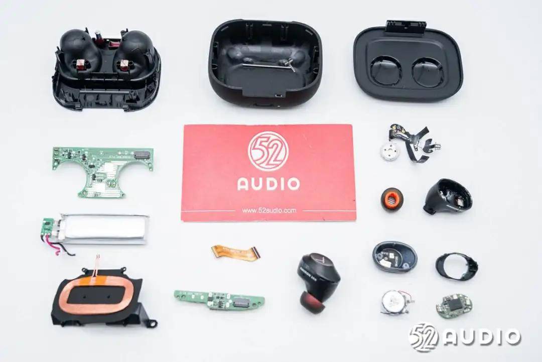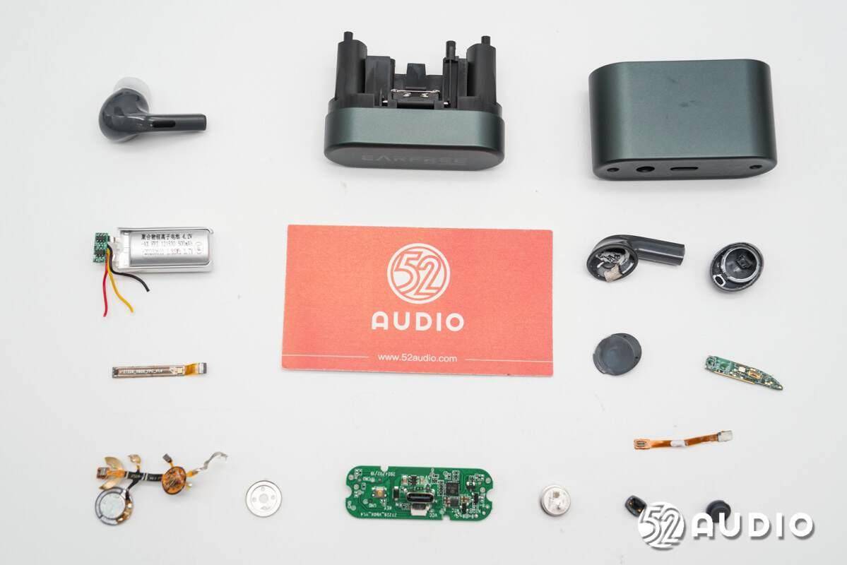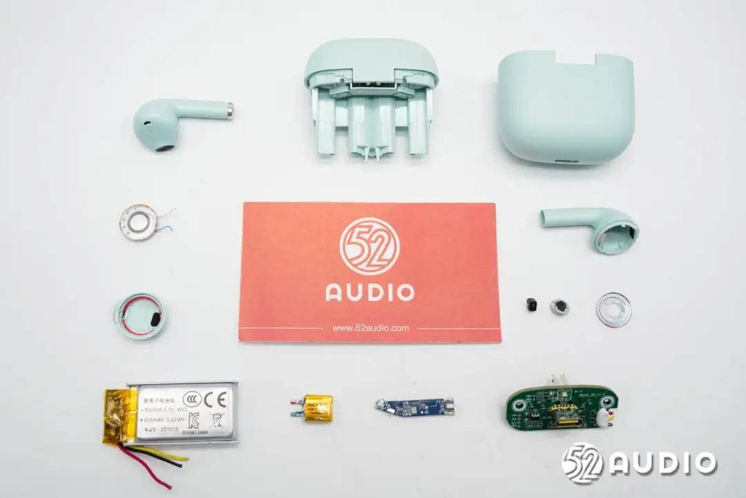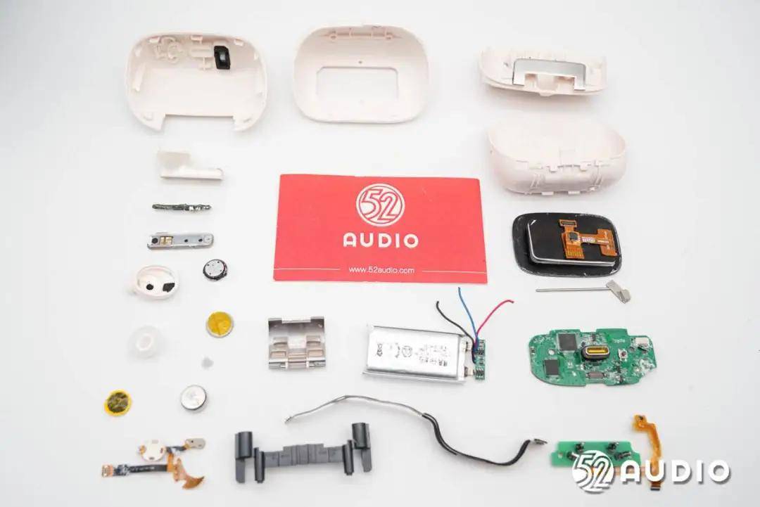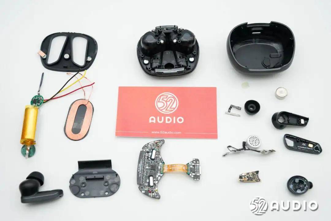 耳机内部搭载了12.4mm镀钛振膜动圈单元,内置GF新余赣锋58mAh软包扣式电池;主板上,采用了BES恒玄BES2710IUC蓝牙音频SoC,WINSEMI稳先微WSDF2310B锂电保护IC,以及2颗瑞勤电子的MEMS麦克风等方案。