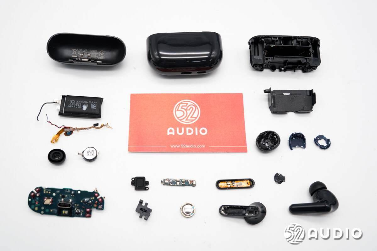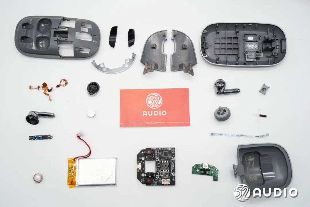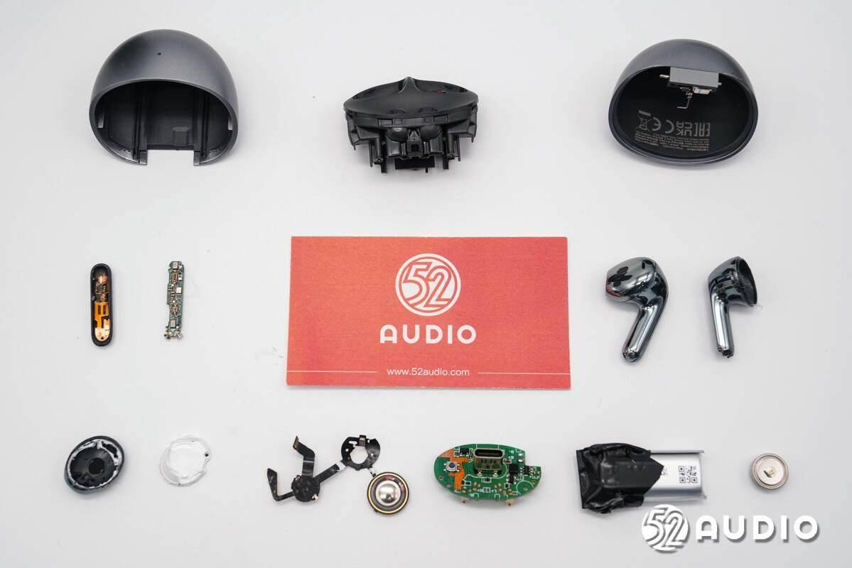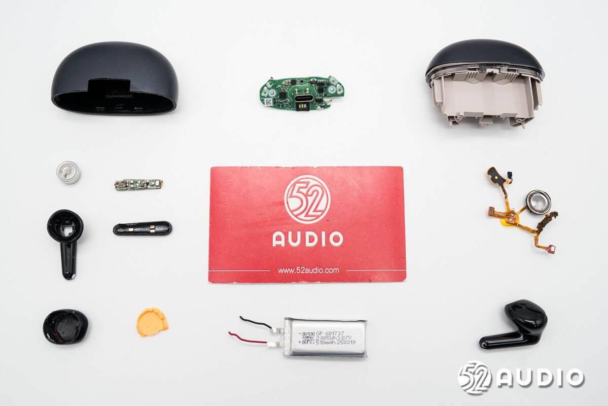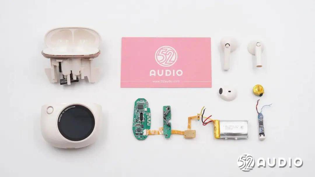 耳机内部搭载了鹏辉能源0.231Wh软包扣式电池,配备Winsemi稳先微WSDF5316B锂电保护IC;采用了10mm动圈单元,单耳内置三颗敏芯微电子的MEMS麦克风拾音;主控芯片为AIROHA达发AB1565AM蓝牙音频SoC,支持蓝牙5.3,支持LE audio,支持Hybrid主动降噪功能;其他还采用了Spacetouch普林芯驰SPT513S多功能入耳触摸压感检测芯片等。