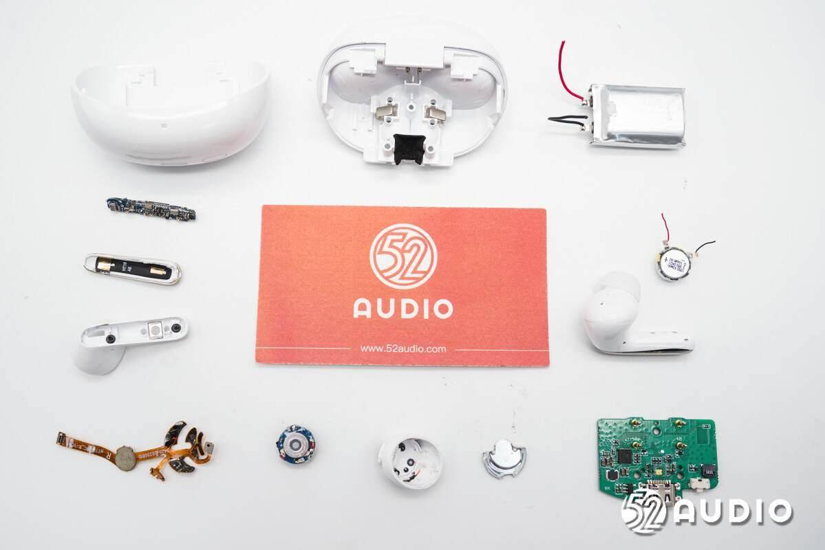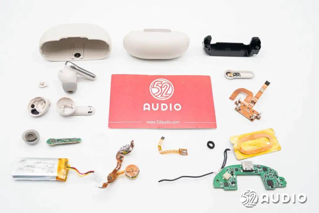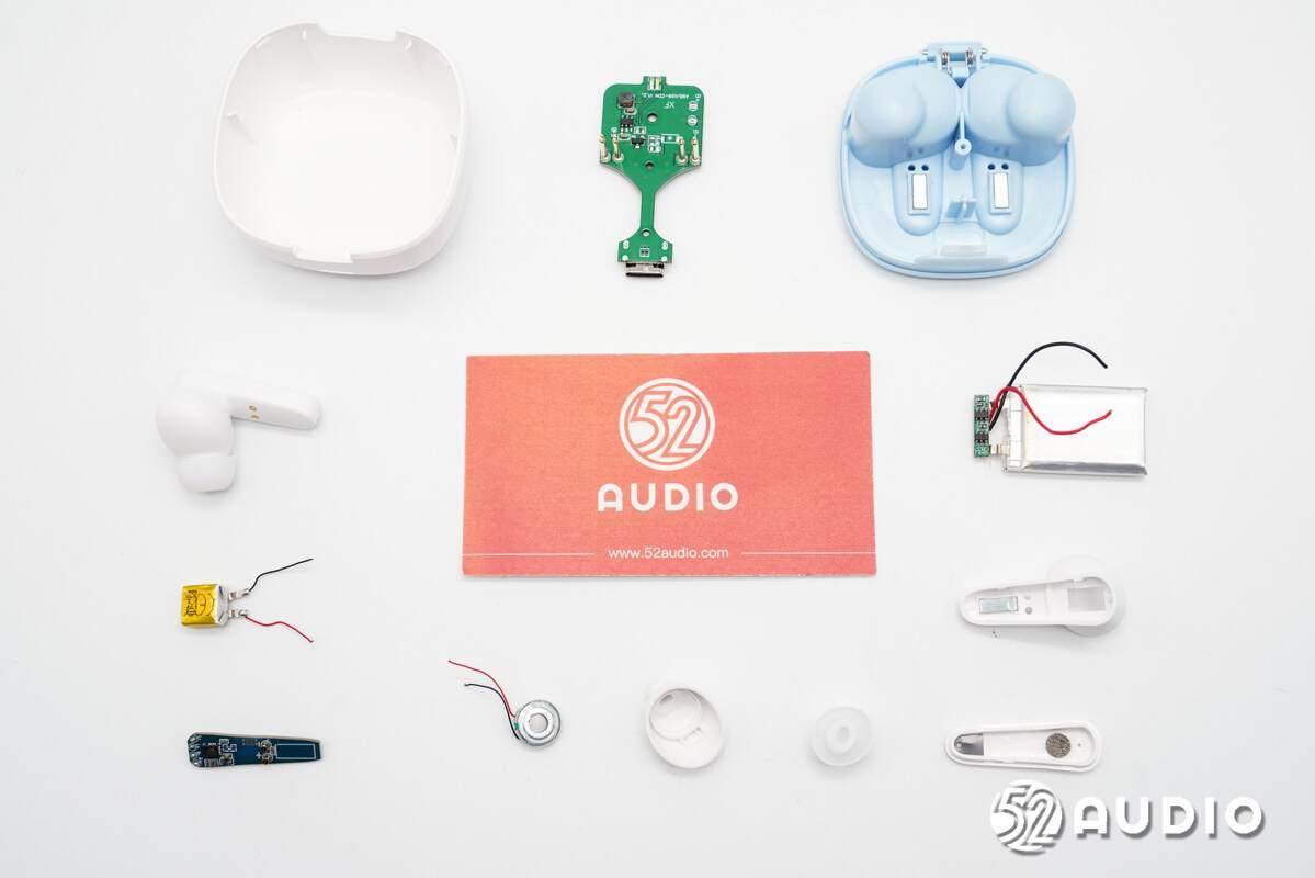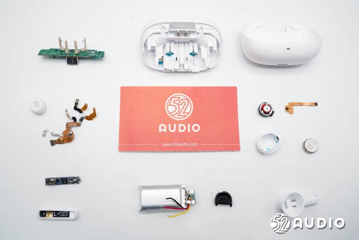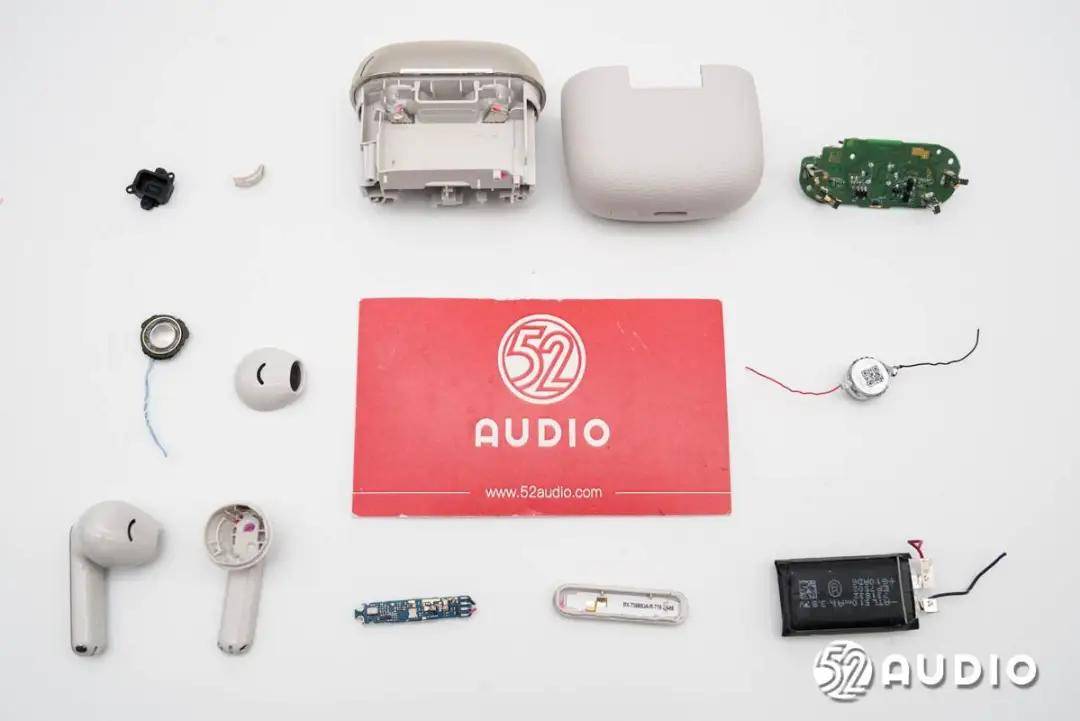 耳机内部搭载了鹏辉能源0.231Wh软包扣式电池,配备Winsemi稳先微WSDF5316B锂电保护IC;采用了10mm动圈单元,单耳内置三颗敏芯微电子的MEMS麦克风拾音;主控芯片为AIROHA达发AB1565AM蓝牙音频SoC,支持蓝牙5.3,支持LE audio,支持Hybrid主动降噪功能;其他还采用了Spacetouch普林芯驰SPT513S多功能入耳触摸压感检测芯片等。