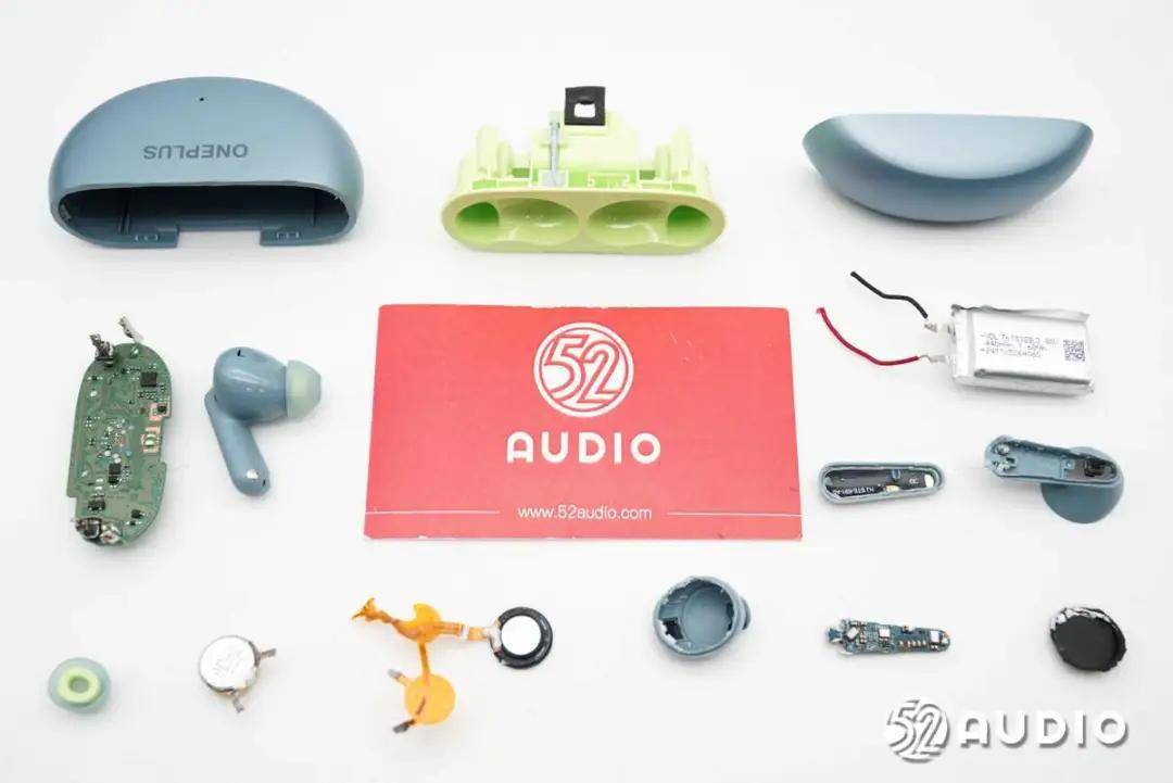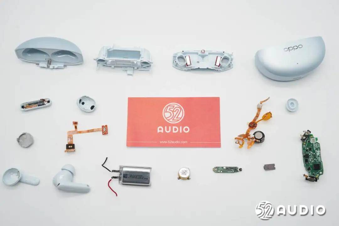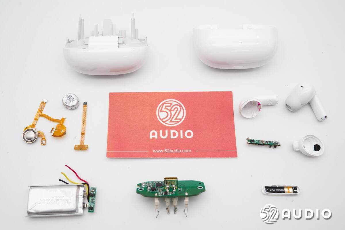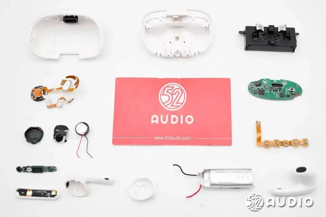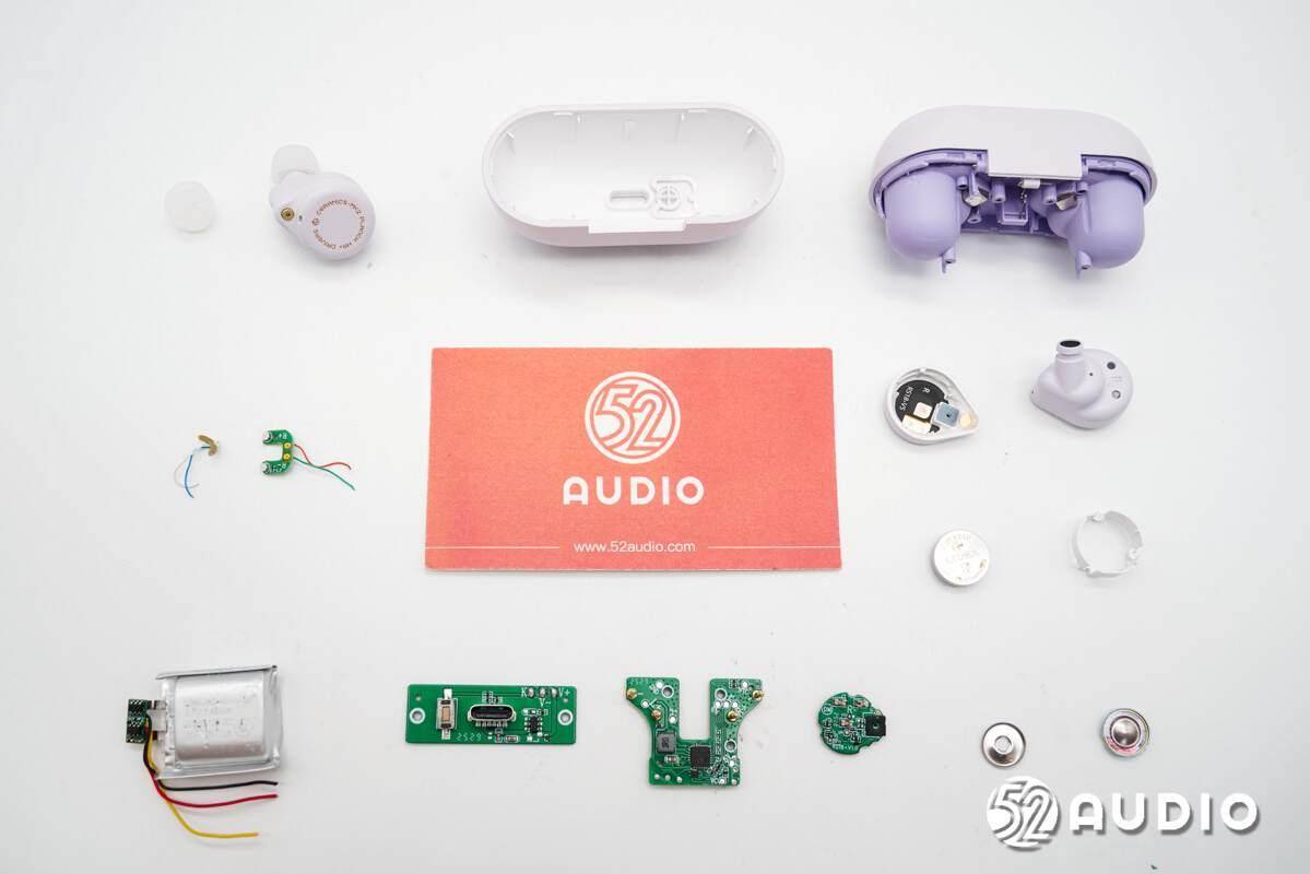 耳机内部搭载了鹏辉能源0.231Wh软包扣式电池,配备Winsemi稳先微WSDF5316B锂电保护IC;采用了10mm动圈单元,单耳内置三颗敏芯微电子的MEMS麦克风拾音;主控芯片为AIROHA达发AB1565AM蓝牙音频SoC,支持蓝牙5.3,支持LE audio,支持Hybrid主动降噪功能;其他还采用了Spacetouch普林芯驰SPT513S多功能入耳触摸压感检测芯片等。