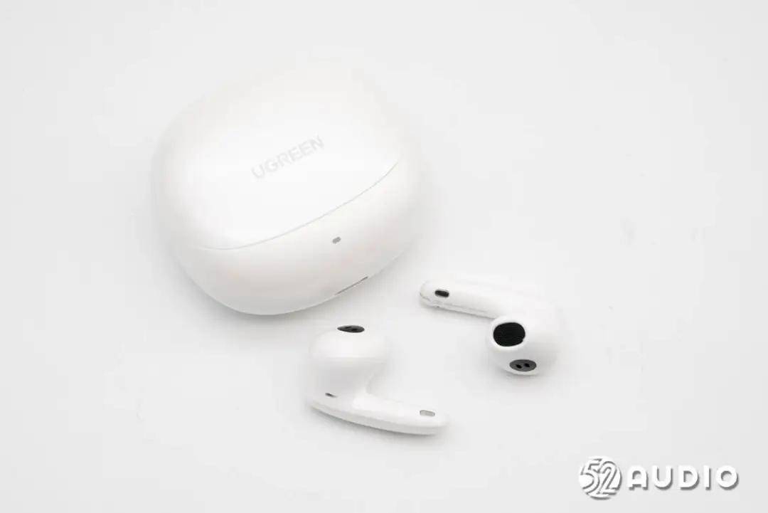 UGREEN绿联HiTune H6 Pro真无线降噪耳机在外观方面,扁平化设计的充电盒,体积轻薄,便于携带;类珍珠质感的工艺设计,带来出色的质感;开放式的座舱结构,耳机取放便捷。半入耳式的耳机,体积小巧,佩戴舒适轻盈;耳机柄采用曲线弧形设计,搭配同样类珍珠质感的盖板装饰,佩戴时尚美观。