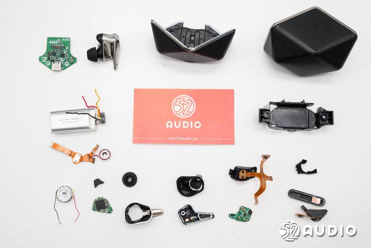 耳机内部搭载HJ弘捷3.85V/43mAh软包扣式电池,采用了6mm镀钛振膜高频喇叭+11mm复合振膜低频喇叭双单元,内置了3颗意芯微电子的MEMS麦克风;主控芯片为WUQI物奇WQ7035AX-B蓝牙音频SoC,其他还采用了HX天易合芯HX9031A电容式距离传感器,Sunlord顺络电子SDCL0603Q系列叠层陶瓷电感和MPHM系列功率电感等方案。