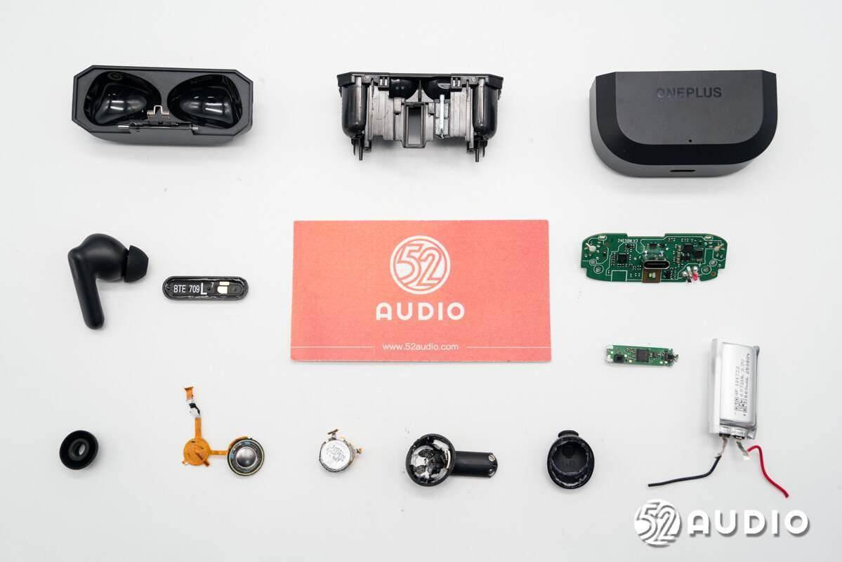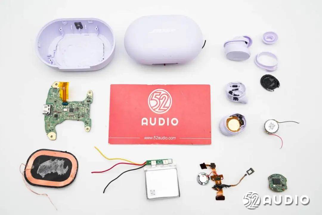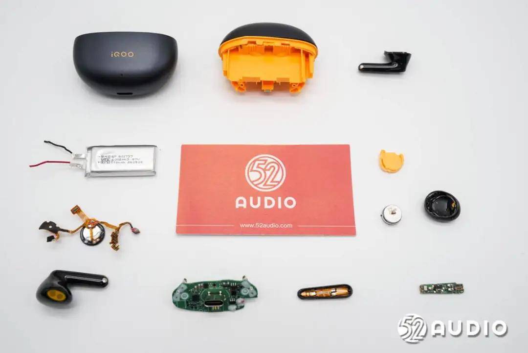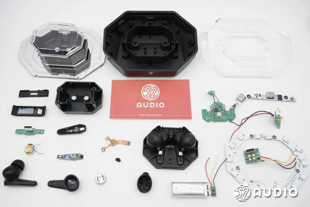 耳机内部搭载YD亿等新能源40mAh软包扣式电池,采用了10mm动圈喇叭,单耳内置三颗MEMS麦克风;主板上采用了REALTEK瑞昱RTL8773ESL蓝牙音频SoC,Sunlord顺络电子SDCL0603Q系列叠层陶瓷电感等。适配器内部搭载REALTEK瑞昱RTL8763EAU蓝牙音频SoC,用于与耳机实现超低延迟的无线传输。