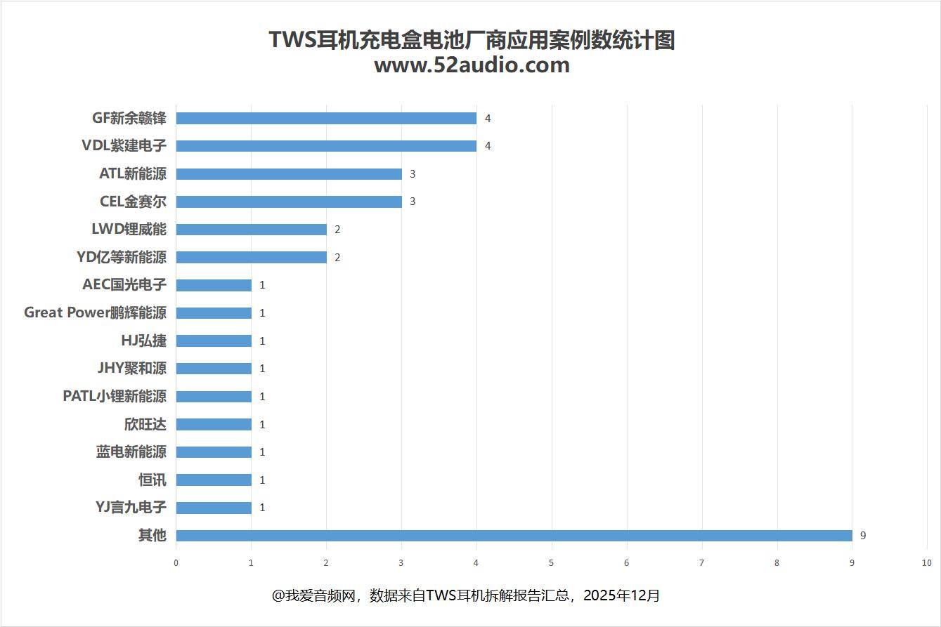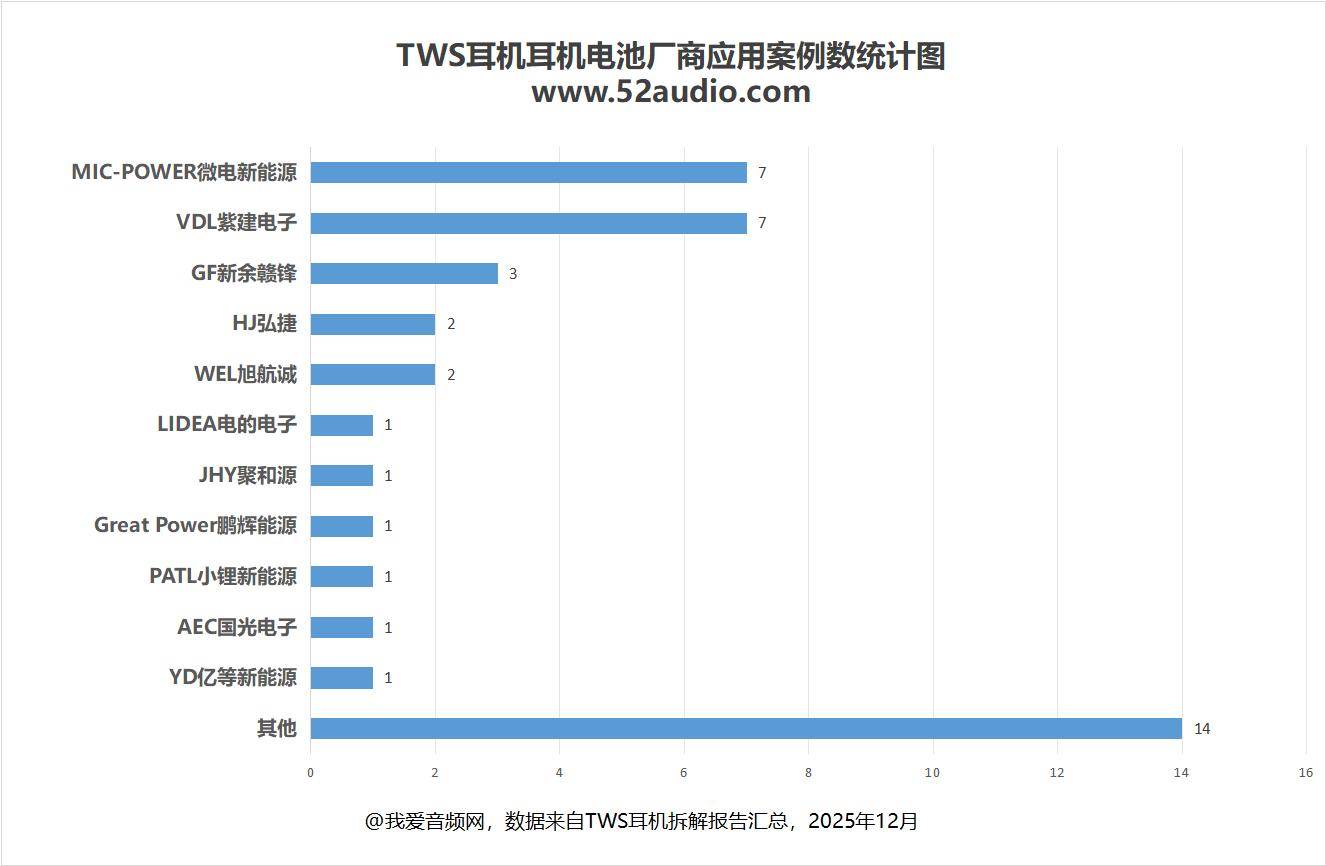 此次汇总的41款TWS耳机中,耳机采用的电池厂商包括了MIC-POWER微电新能源、VDL紫建电子、GF新余赣锋、HJ弘捷、LIDEA电的电子、JHY聚和源、Great Power鹏辉能源、PATL小锂新能源、WEL旭航诚、AEC国光电子、YD亿等新能源等。其中,MIC-POWER微电新能源、VDL紫建电子等获得了多款产品采用。