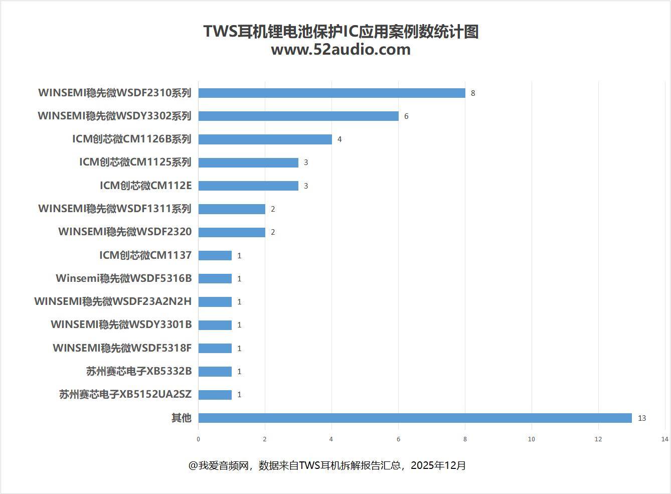此次汇总的41款TWS耳机中,采用的锂电池保护IC包括了ICM创芯微、WINSEMI稳先微、苏州赛芯电子等厂商旗下方案。其中WINSEMI稳先微WSDF2310系列、WSDY3302系列,ICM创芯微CM1126B系列、CM1125系列、CM112E方案获得了多款产品采用。