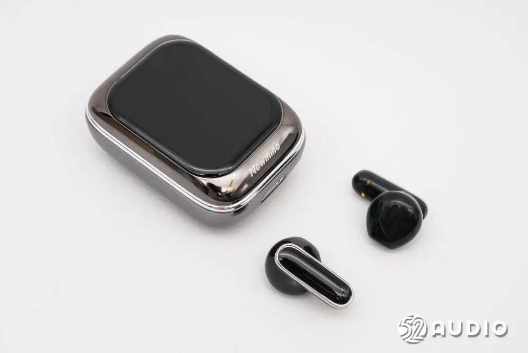 Newmine纽曼G9带屏真无线耳机在外观设计方面,充电盒采用了滑盖设计,开合便捷;电镀工艺处理,拥有着出色质感;同时搭载了大尺寸触摸显示屏,进一步丰富用户体验。耳机采用了柄状的半入耳式设计,光滑圆润的烤漆质感,体积小巧迷你,重量仅3.3g,佩戴舒适轻盈。