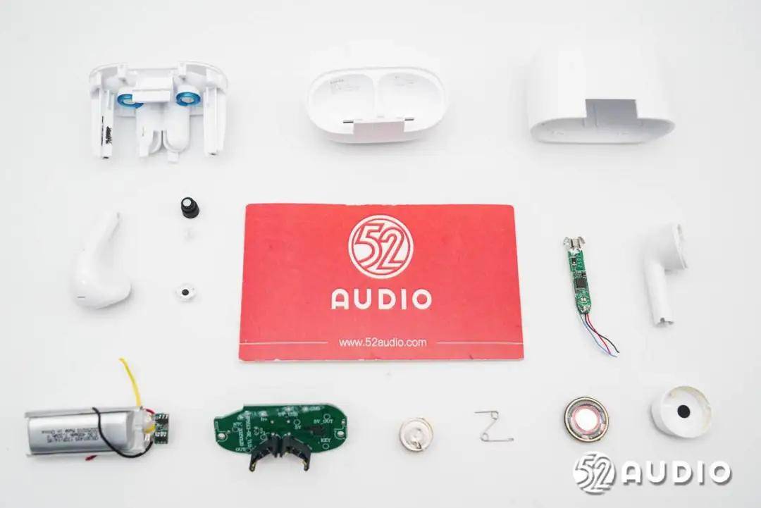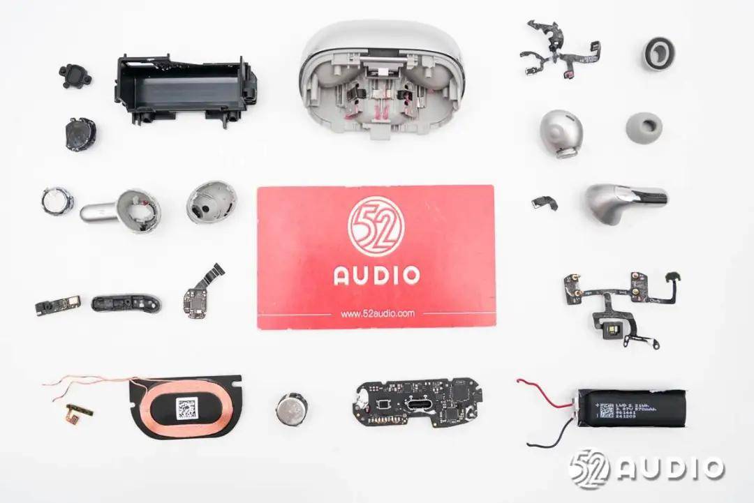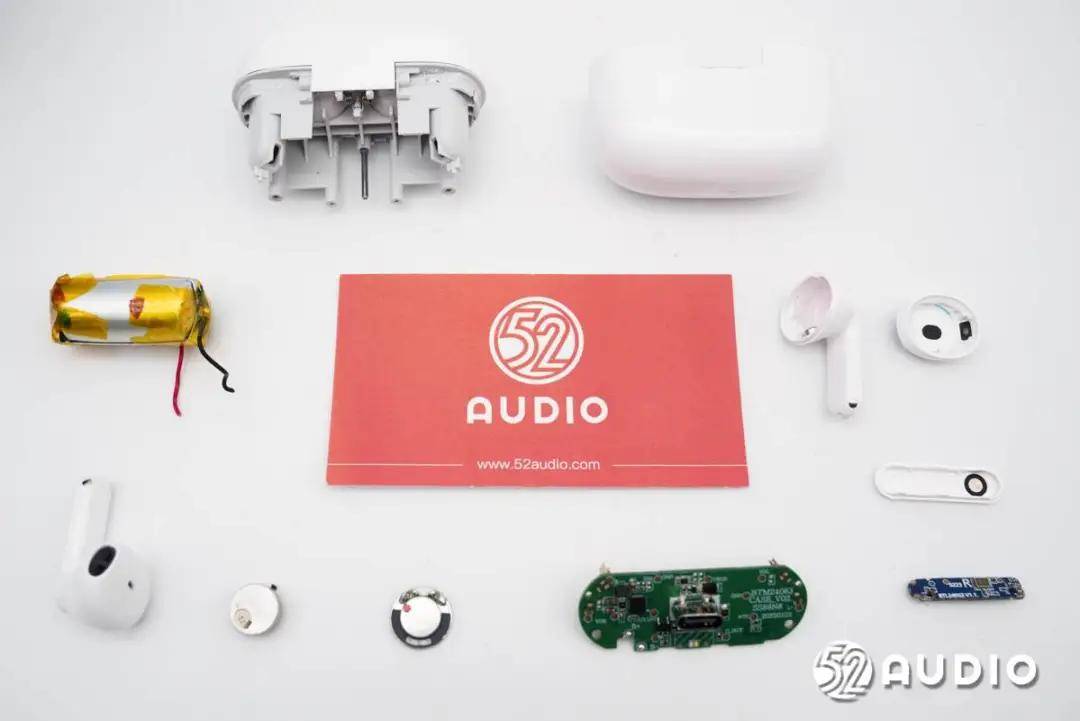 耳机内部搭载了3.81V/58mAh钢壳扣式电池,采用了苹果定制的驱动单元,内置了3颗MEMS麦克风以及心率传感器、皮肤识别传感器、触控传感器等。主控方案延续了上代的苹果H2耳机芯片,但采用了与AirPods 4内部相同的SiP封装。