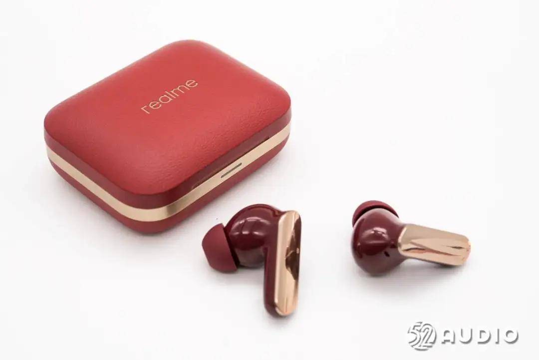 realme线 Pro真无线降噪耳机外观设计精致耐看,极具品牌辨识度。其炽焰红配色的圆角方形充电盒,采用仿皮革纹理,搭配金属拉丝金色腰线和金色品牌LOGO,宛如首饰盒,展现出轻奢质感。同时充电盒体积非常小巧,使用便携。柄状的入耳式耳机,采用了深红与金色搭配,呈现了一种中式的高级感。