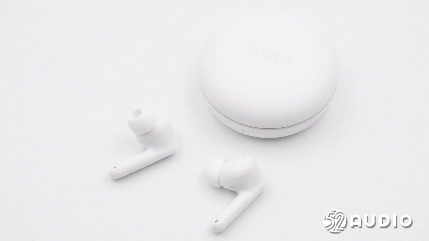 HONOR荣耀Earbuds A Pro真无线降噪耳机在外观方面,充电盒采用了“粉饼盒”状的圆形设计,体积小巧轻薄,便于携带。耳机采用了柄状的入耳式设计,光滑亮面质感,佩戴舒适贴耳;白色配色,简约洁净。