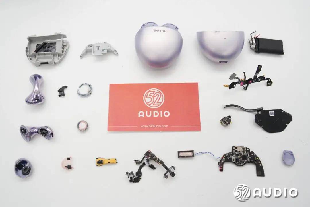 耳机内部,采用了39.5mAh/3.88V钢壳扣式电池;搭载了双磁动圈低音单元+超高频微平板高音单元双单元,内置三颗MEMS麦克风+骨传导VPU拾音;主控芯片为SiP封装的华为自研Kirin麒麟A2芯片;其他还采用了Southchip南芯半导体SC7289线性充电IC,赛微微电CW2215B锂电池电量计芯片,Sunlord顺络电子SDCL0603Q系列和SDCL0402H-01系列叠层陶瓷电等。