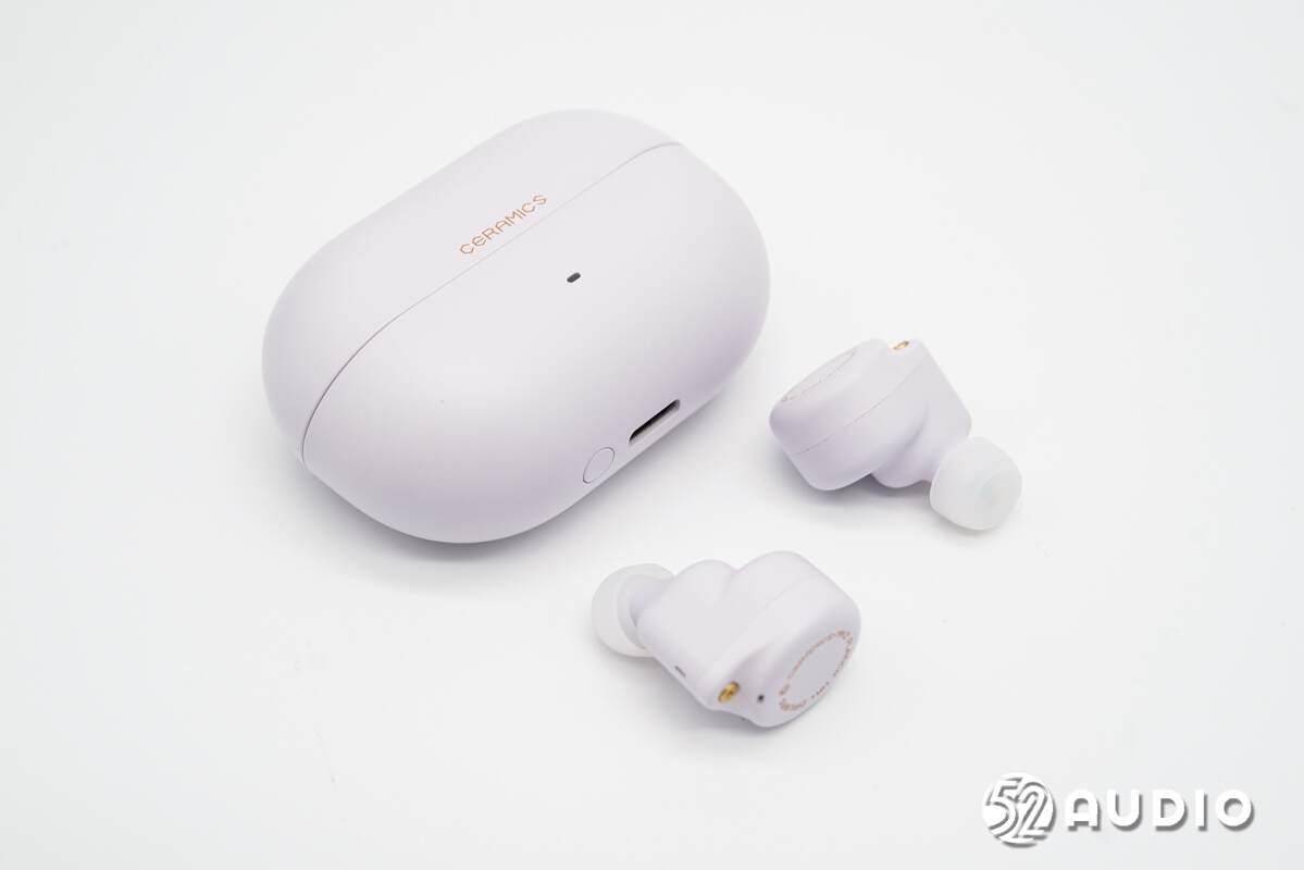 ROSESELSA弱水时砂CERAMICS-MK2真无线降噪耳机在外观方面,延续了琉璃系列的经典设计,独具品牌特色。充电盒采用椭圆形设计,哑光质感,体积小巧便携。耳机采用了豆状的入耳式设计,浅紫色配色搭配金色点缀,佩戴时尚淡雅;耳机体积也比较小巧轻盈,能够提供舒适佩戴。